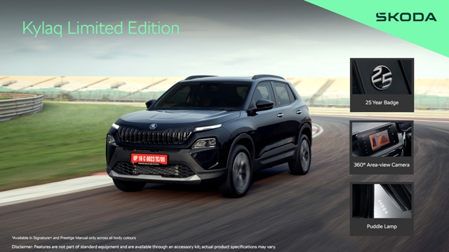 Kylaq, જે Škodaની નવીનતમ SUV પ્રસ્તુતિ છે, તે આ ઉજવણીમાં Signature+ (MT) અને Prestige (MT) સંસ્કરણોના લિમિટેડ એડિશનના રૂપમાં સામેલ થાય છે.લિમિટેડ એડિશન સાથે ભેટરૂપ એક્સેસરીઝ કિટ પણ છે, જેમાં 360-ડીગ્રીકેમેરા સેટઅપ, પડલ લેમ્પ્સ અને બી-પિલર ઉપર 25મીવર્ષગાંઠનો બેજ પણ છે.ગ્રાહકોને લિમિટેડ સંસ્કરણ Kylaq માટે 7 બાહ્ય રંગોમાંથી પસંદગી કરવા મળે છે.